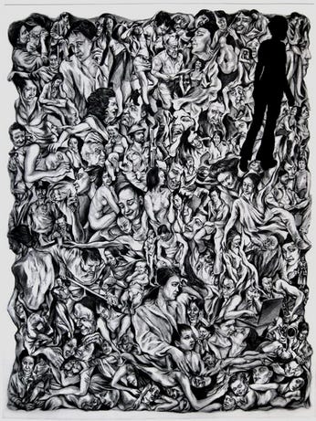 Equally vegetal is “The Green Man,” one of two talismanic relief sculptures by Anne Bouie, whose head is wreathed by yellow-edged green leaves. “Green Man” and its engrossing companion piece, “The Dark Sacred Night” -- both tall enough to play in the NBA -- are imposing and mythic. The latter’s impassive face sits within a halo of black-painted clam shells, suggesting that Black identity was born from the sea as well as the earth.