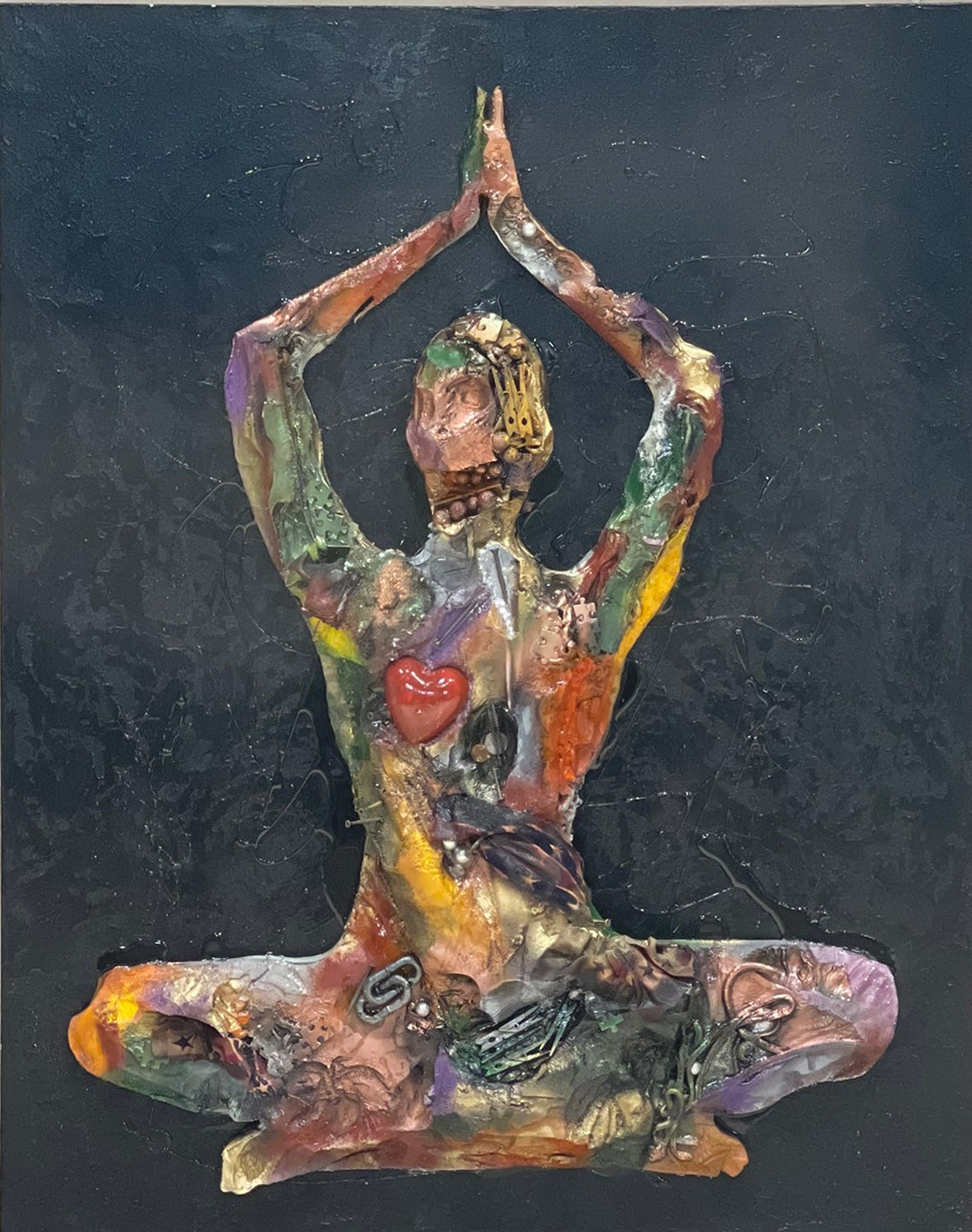 More painting than sculpture, but still chunky with found objects, are Reggie Gillumo’s relief studies of single figures, whether meditating or making music. The artist employs metallic pigments that complement the many small steel objects encompassed by the thick pigment. Again, the pieces evoke a sense of emergence from a larger environment, becoming singular while retaining fundamental material.