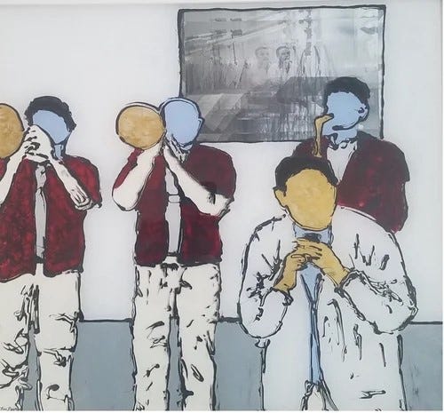 ARTHUR ASHE, FELA KUTI, AND QUINCY JONES INSPIRED three of the collage-paintings in Tim Davis’s show at Fred Schnider Gallery of Art, but the pictures are not literal portraits. Most of the local artist’s recent work depicts multiple people in some sort of dialogue, which is why the exhibition is titled “Conversations.” A few of these interchanges are depicted at an art gallery such as International Visions, which Davis ran from 1997 in 2019 in Woodley Park.