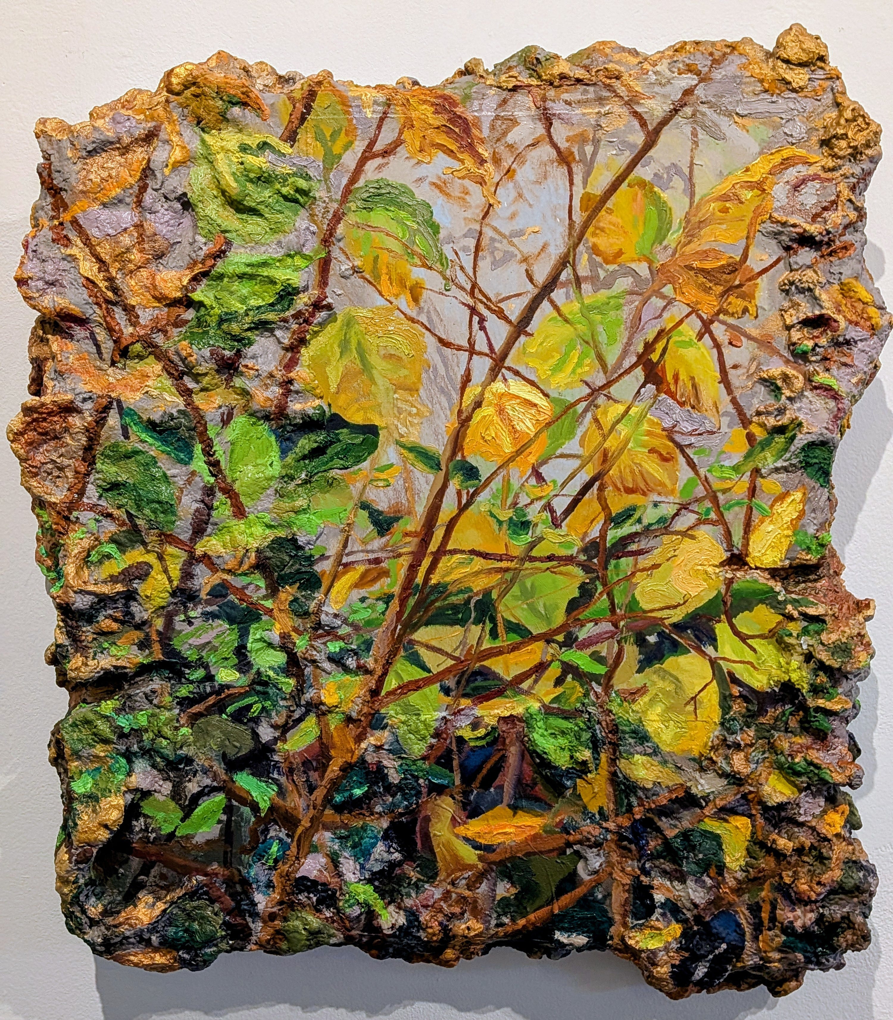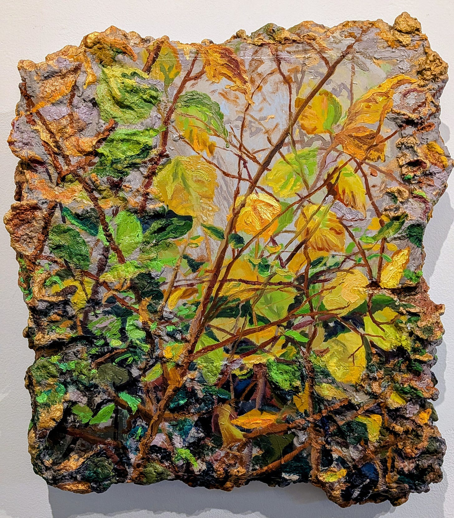 The exhibition, curated by Reem Bassous and Jan Dickey, features artists from Chicago and New York City as well as D.C. The last group consists of Hutchison, traditionalist-futurist Elaine Qiu, expressionist Eric Uhlir, and nature artist Lindsay Mueller, whose intimate landscapes are made on chunky, rough-edged slabs of paper and paper clay, Mueller’s sculptural style is akin to that of Xiaohan Jiang, whose “Shared Smoke” is painted on felt that swirls up and away from the panel on which it’s mounted.