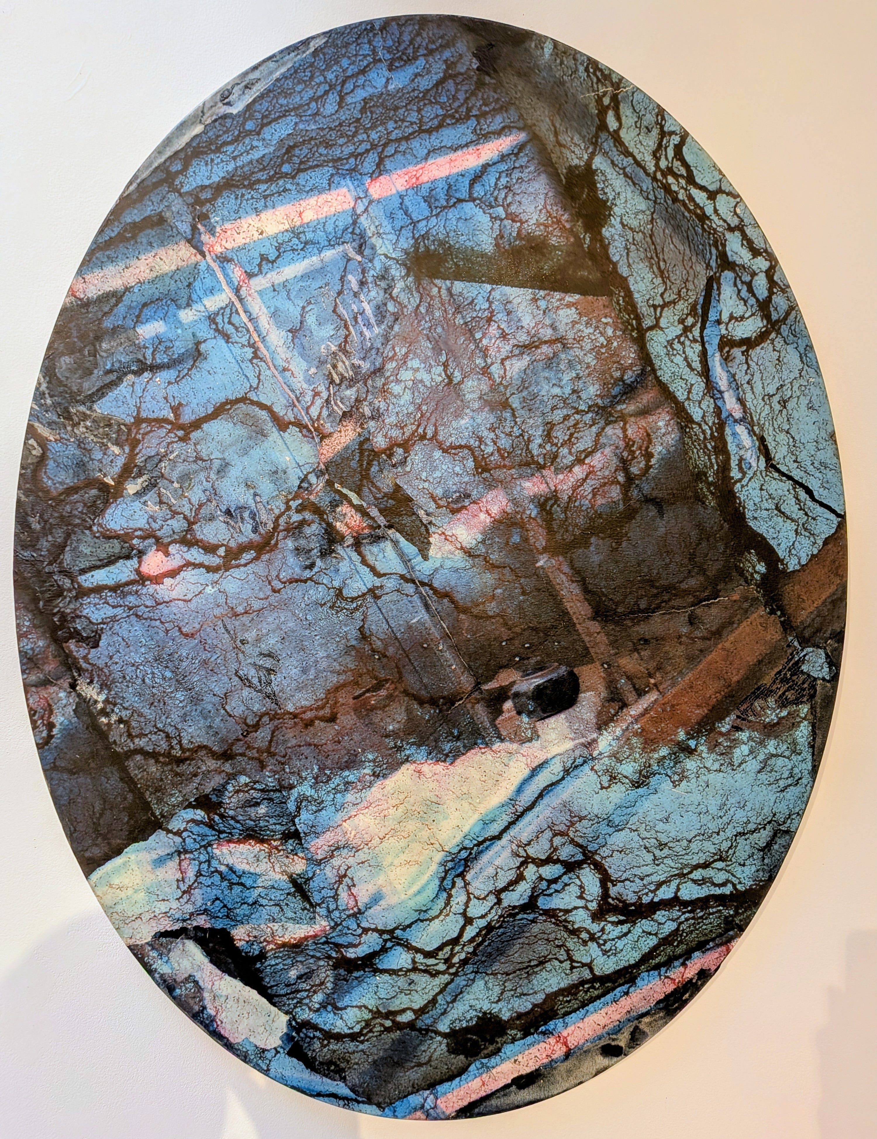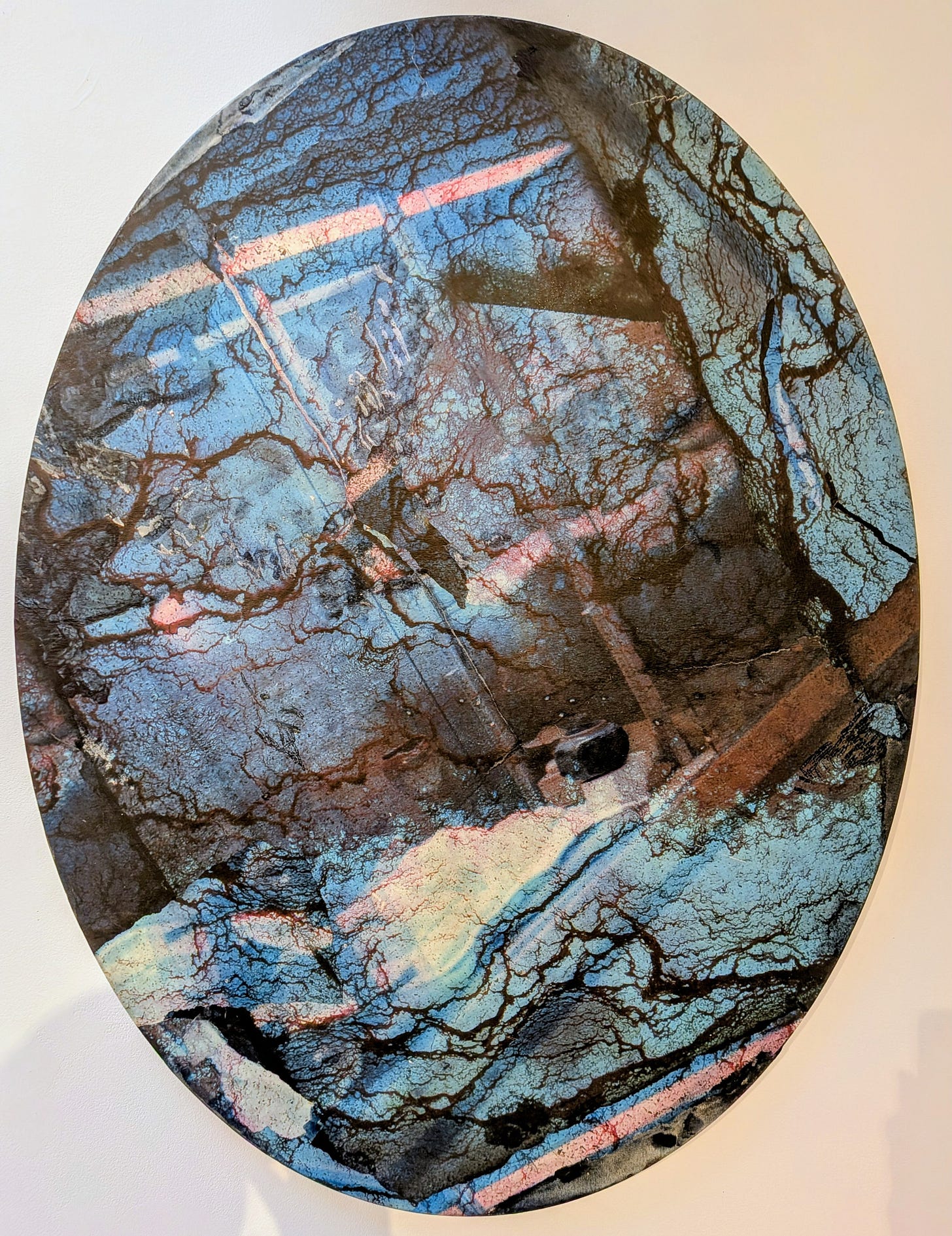 A similar format frames a much more intricate image in Don Kimes’s exquisite “Blue Falling,” a mixed-media oval picture. This richly layered, predominantly blue piece appears to overlay images of the natural and built worlds, glimmering with reflected pink and white light. There may be a house within the artwork’s depths, linking it to David Douglas’s atmospheric treated photo of a large American home, glimpsed through a painterly haze of hue and mist.
