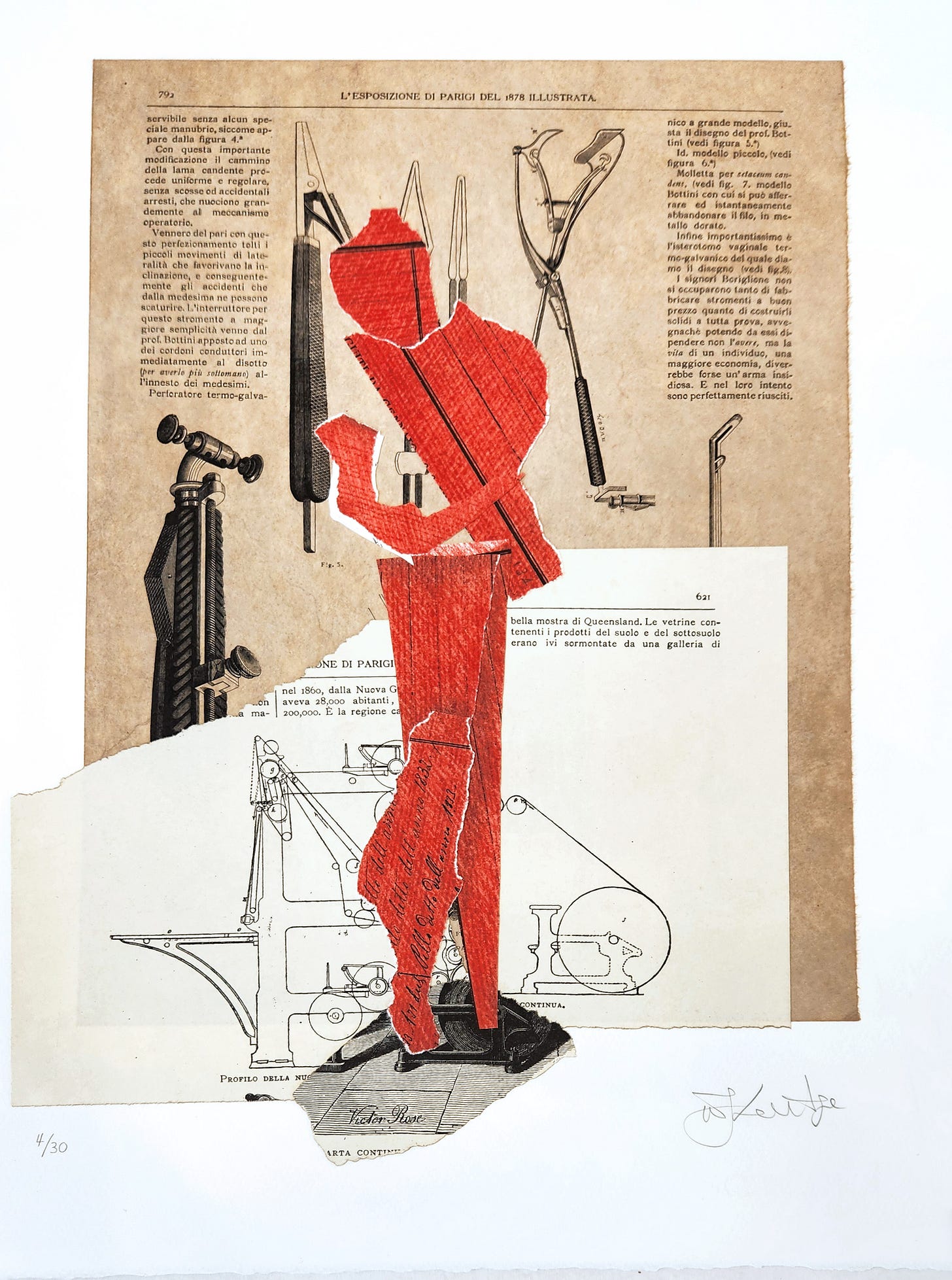 A VAGUELY HUMAN FIGURE MADE OF SCARLET SCRAPS centers “Questa Importante Modificazione,” a collage-print that’s one of the attention-getting pieces in William Kentridge’s “Vertical Thinking.” While that red is the only bright color in the Gallery Neptune & Brown show, luxuriant hues are hardly lacking in this selection of prints, drawings, and collages from 1993 to 2024. The veteran South African artist is a master of grays. Such prints as the three-panel “Medicine Chest” supply a rainbow of middle tones, seemingly layered like pencil marks.