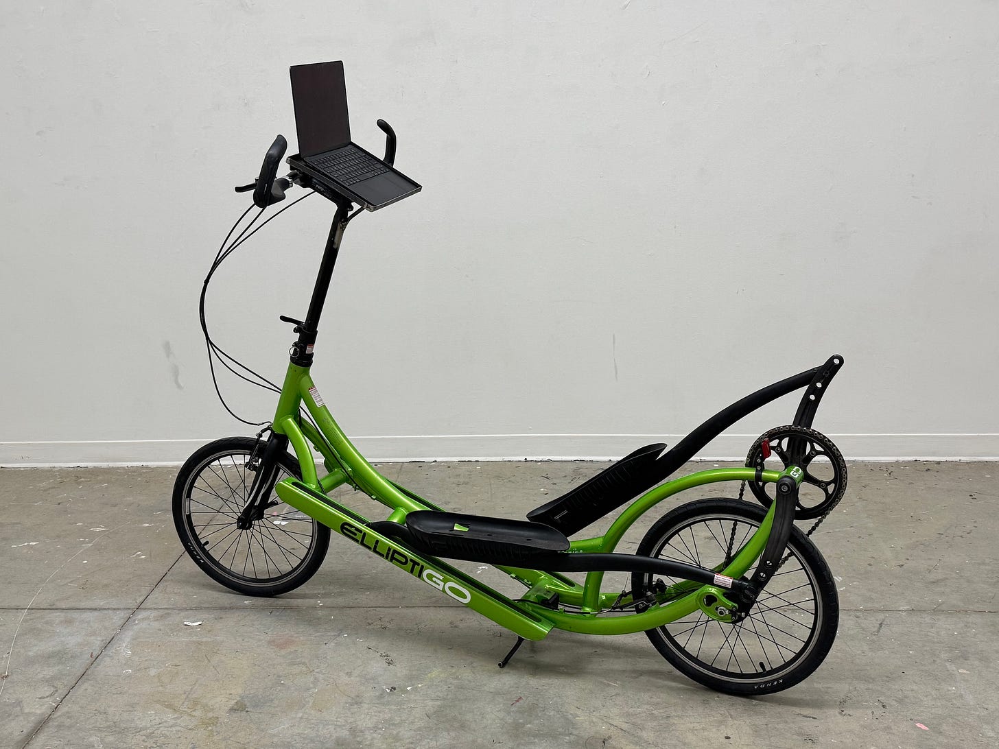 No less complex but visually starker are Behrouz Vatankhah’s sculptural paintings, one of which is backlit by LEDs. The Tehran-born artist’s work is abstract, yet seeks to convey what a gallery note calls “personal experiences of anxiety, displacement, and cultural transition.” More directly autobiographical, and appealingly rueful, is Mallory Kimmel’s bound book of partly redacted rejection letters. The artist doesn’t think of herself only, though. “Mobile Work Station I,” a laptop mounted on an elliptical bicycle, is a sardonic monument to the Internet-age rat race.