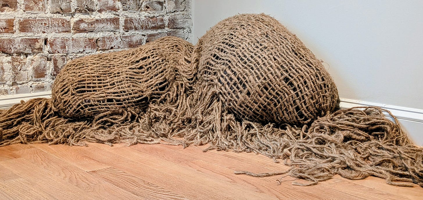 REMNANTS OF FABRIC ARE RARELY VALUED, but in the case of “We Mend in the End Times” they represent things that are precious and even essential: human skin and physiques. The first hint of this is a slumped shape in one corner of D.C. Arts Center’s main gallery. Milan Warner’s “If I lay here long enough,” made of jute netting, suggests a body bag. It appears ready to be loaded into a Vietnam-era chopper or -- containing the live form of the future Count of Monte Christo -- tossed into the Mediterranean.