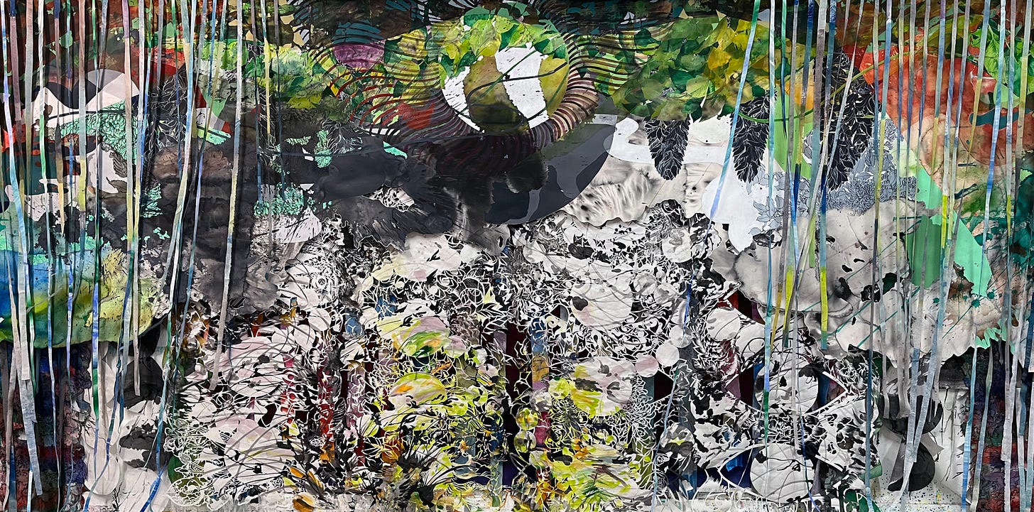 THE MOST EPIC OF KATHERINE TZU-LAN MANN'S RECENT MURALS is the roughly 375-foot-long "Potomac River Shen Series," installed for several months last year in Union Station's vast waiting room. By the numbers, "Seed Float" is comparatively modest. The mixed-media collage-painting, on exhibit 24/7 at 355 Pod Space, is a mere 70 feet long. But that's more than enough to dominate the street-facing window space, which is programmed by the nearby VisArts. In addition, "Seed Float" has the advantages of texture and depth. Where the Union Station piece was printed on vinyl, the newer artwork includes such cutout features as circles and streamers.