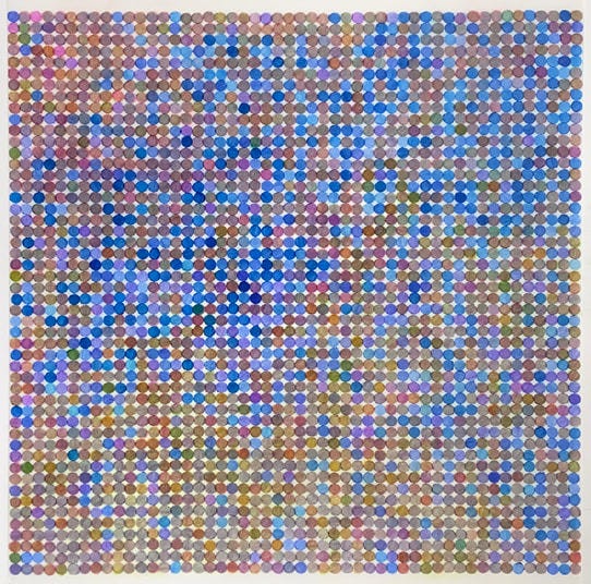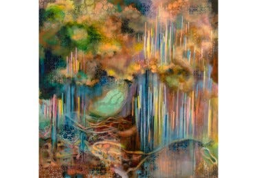 That’s where Mullins’s approach overlaps that of Goldberg, whose pictures are purely abstract but equally attuned to illumination and elemental form. The New Jersey artist paints fields of closely abutting dots whose colors are complexly layered and edges are softly defined. She applies acrylic ink on synthetic Yupo paper, whose non-absorbent surface allows the pigment to pool and meld. The small circles are positioned regularly, but rendered freehand and with several coats in different but complementary hues. The process yields dots that appear to glisten and twinkle, and sometimes seemingly to undulate across the compositions.
