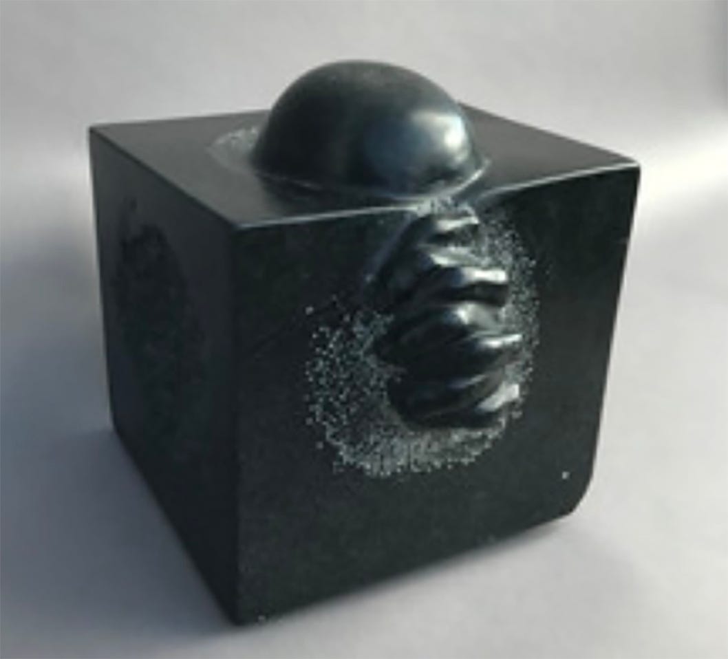 The way that pole partly emerges from a larger entity mirrors the gambits of several other artists. Hair-like fiber bulges from the side of a mulberry-paper pillar in Tatyana Shramko's "Fragile Self I," which is topped by a human head. Equally psychological is Janathel Shaw's painted-stoneware "Looking Beyond the Veil," in which a head stands atop a coffin-like brown body that holds a white skull in its belly. Folded hands protrude from a black soapstone block in Zdeno Mayercak's "Nightfall," and a painting is nestled within the chest of a ragged human figure in Alice Quatrochi's "Emerging from Our Separateness (EFOS)."
