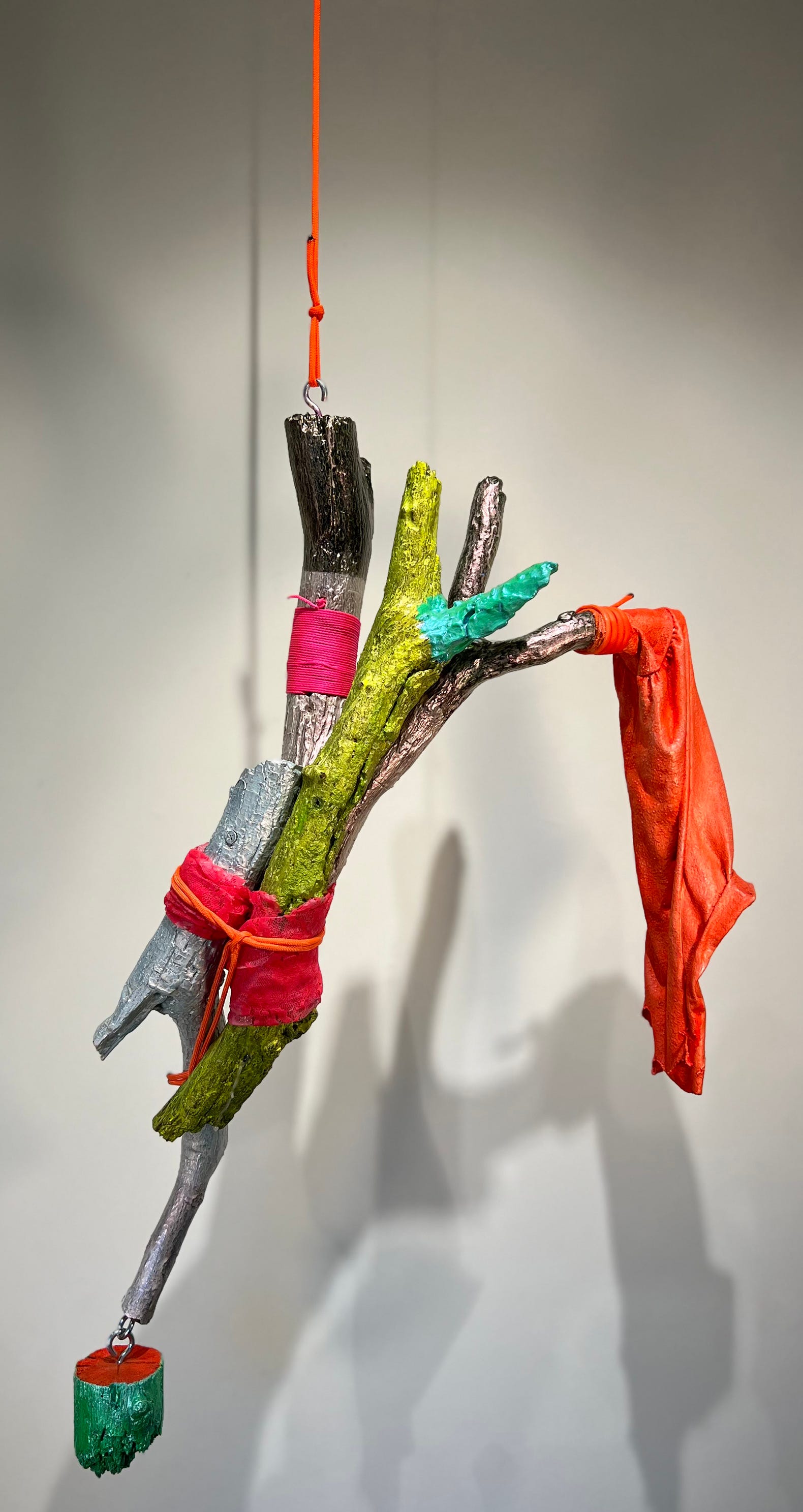 TOM HILL IS ONE OF SEVERAL "Sculpture NOW" contributors who insert natural objects into elaborate assemblages. But he also subverts the natural, as is demonstrated more clearly in "Crackling with Electricity," his solo show at Portico Gallery. Not only does the artist juxtapose tree branches with manufactured objects, but he also paints the wood in such brazenly artificial colors as silver, chartreuse, and hot pink. The goal, according to Hill's statement, is to express "churning sexuality," "swirling gender realities," and "queer energy."