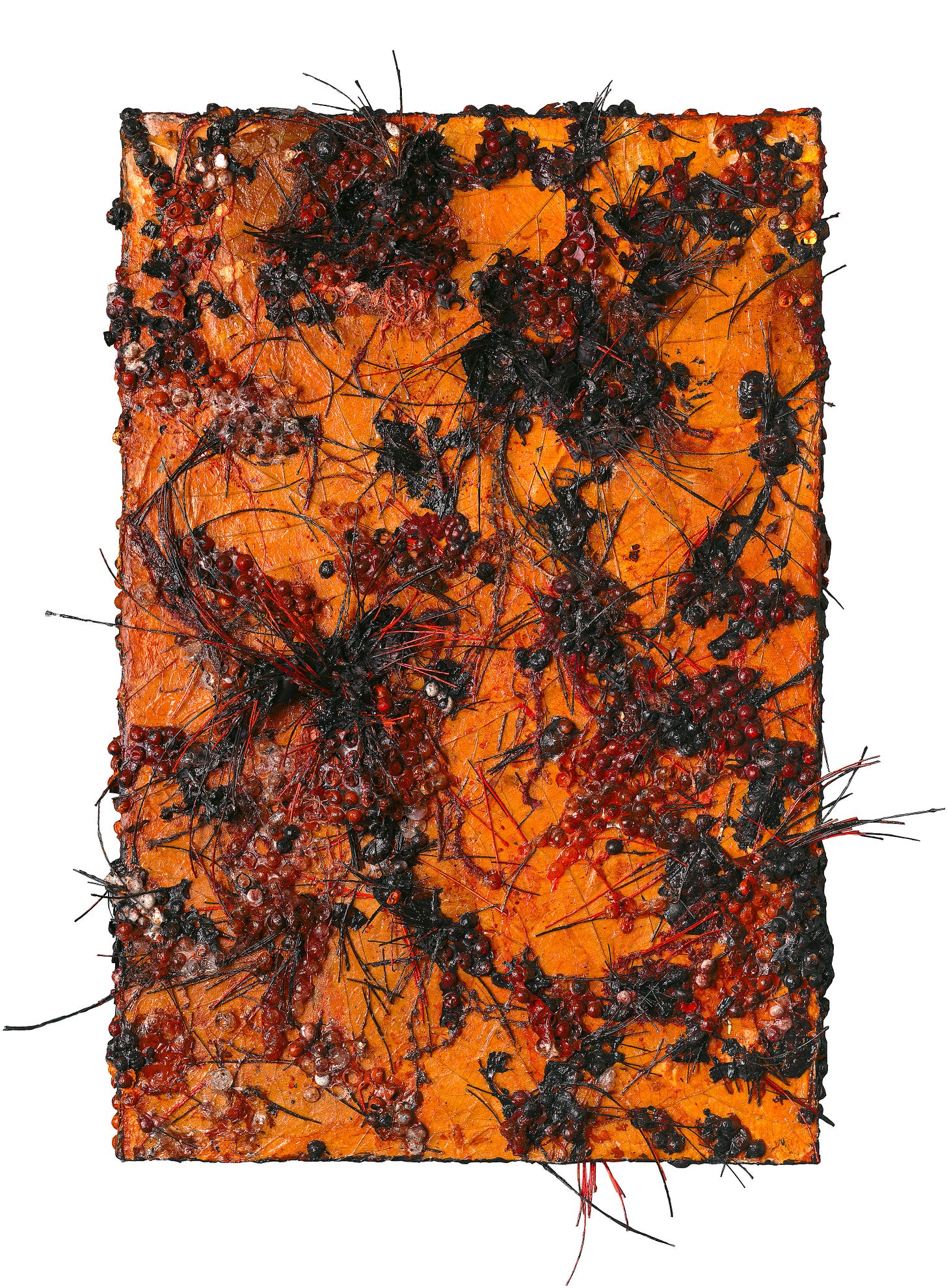 The most flamboyantly three-dimensional pieces are two titled "Thanatopsis" and numbered II and III. Like most of these works, the pair feature black backdrops, while juxtaposing wood engravings with clusters of red, white and gray fibers that evoke everything from plant tendrils to human nerves and sinews. These views of death don't evoke a morgue, however. Instead, they suggest a fecund rainforest where lifeless matter is promptly repurposed into new existence.
