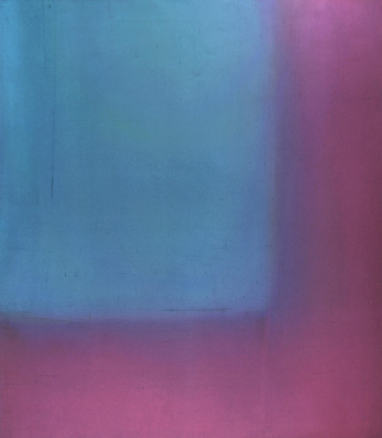 Almost half of the show's entries are in the "Dwelling" series, which were partly inspired by views of sea, sky, and land the artist experienced on a visit to Australia. These pictures frame a rectangular block of soft color within an L-shaped partial border, rendered in a different but often closely related hue. The porous doorways suggest portals to the sublime.