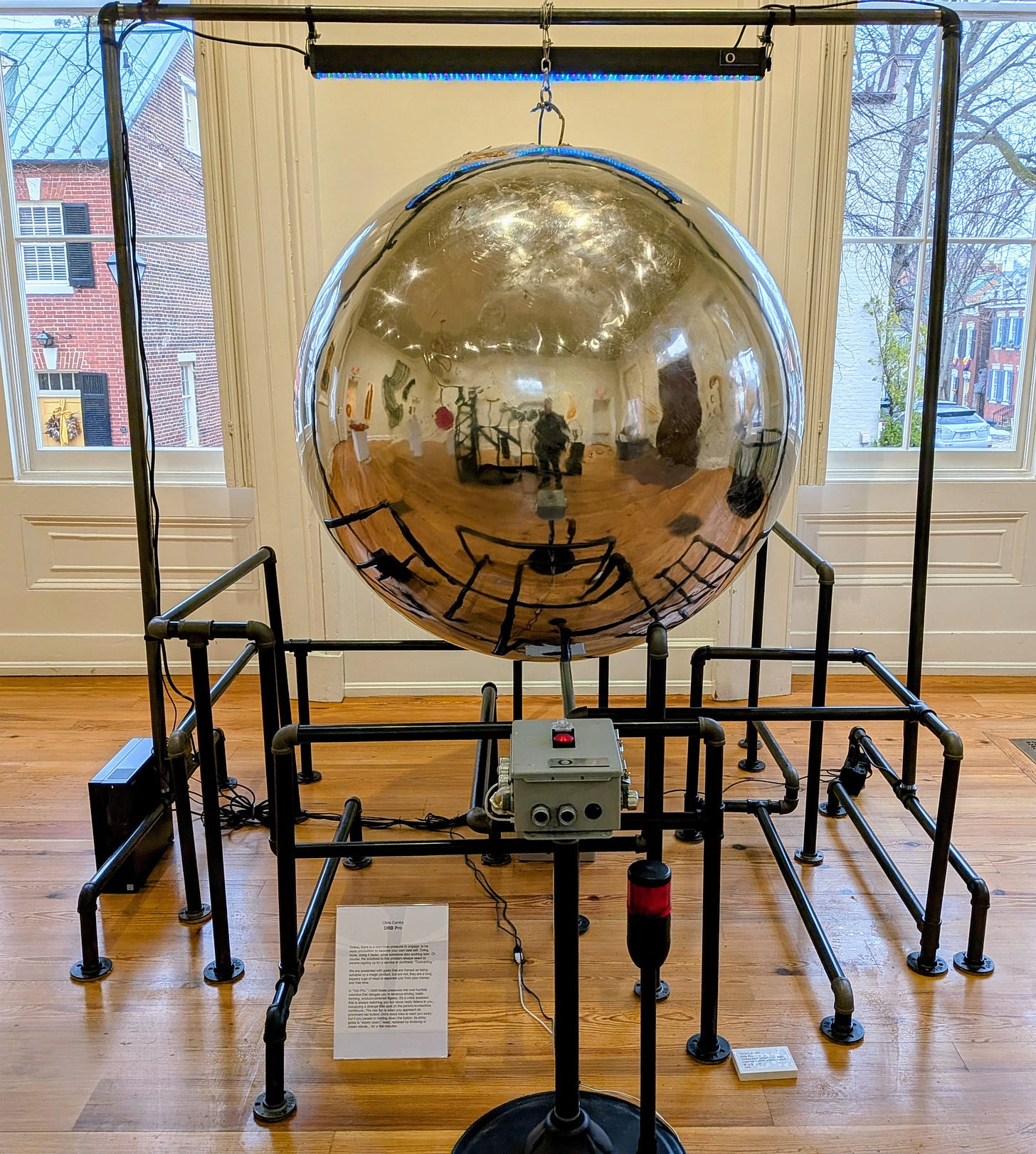 Chris Combs’s “ORB Pro” is also interactive, but the system it evokes is anything but natural. With playful irony, the high-tech artist employs a large reflective chrome sphere and other metal parts to embody the virtual world of the Internet. A prattling female voice represents the web’s endless flow of distraction, which Combs has made interruptible by pressing a red button. Holding down that button temporarily switches the chatter to soothing natural sounds, but only after -- hilariously -- the voice has implored the netizen not to hush its monologue.